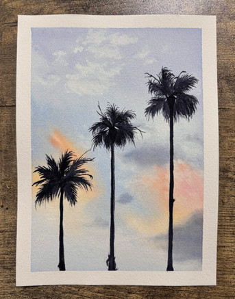 I love clouds. It's been a long-time wish of mine to be able to paint them. These watercolor pieces are based on reference photos from my camera roll. Some of my favorite features in the sky are crepuscular rays and clouds glowing in the sunset. It's also been fun to explore different foregrounds for these scenes.